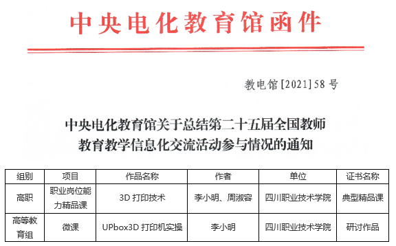 智能制造学院推荐的2件作品均获奖,其中职业岗位能力精品课1件、微课作品1件。