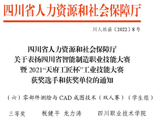 我校智能制造学院代表遂宁市参赛的税健平、龙力涛两名选手,在李小明、罗辉两位老师的指导下,在“零部件测绘与CAD成图技术”比赛项目中荣获三等奖。