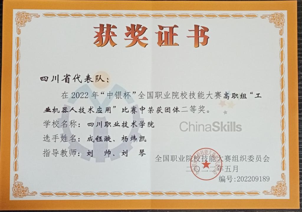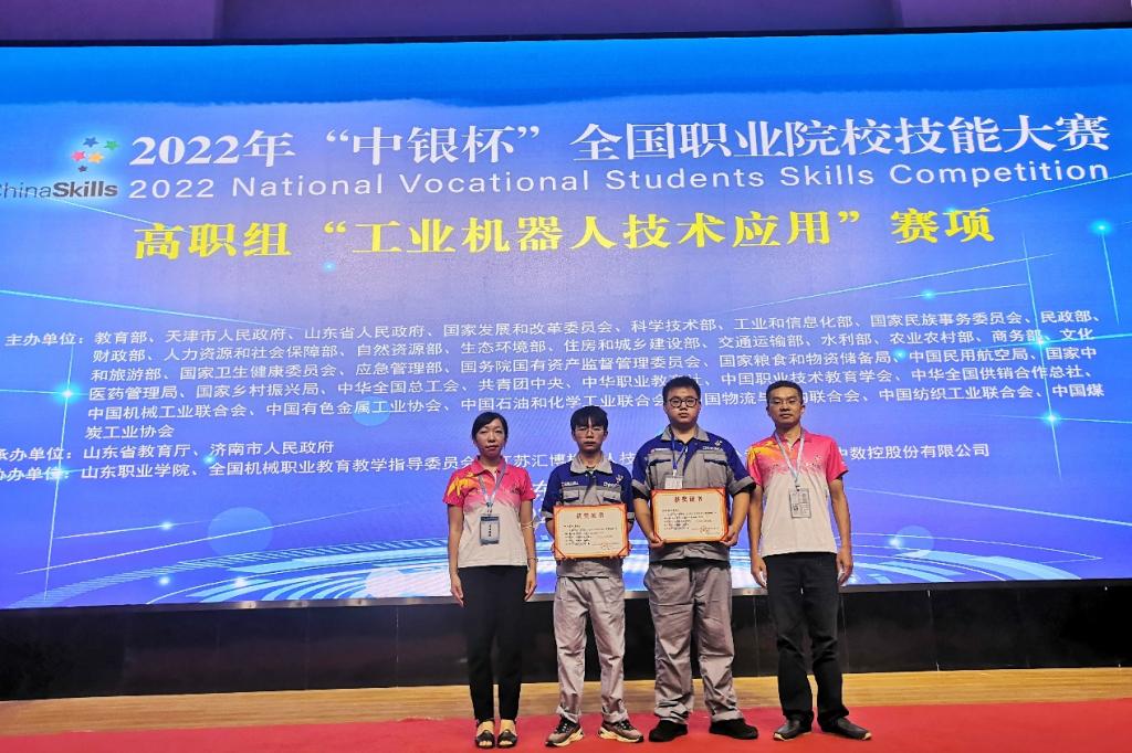 2022年8月21日-26日,全国职业院校技能大赛“工业机器人技术应用”赛项在山东职业学院举行,由我校智能制造学院刘帅、刘琴两位老师指导,成钰漩、杨炜凯两位同学组成的代表队获得全国二等奖。
