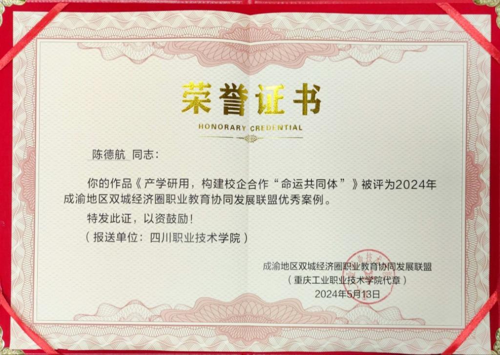 在会议的优秀案例评选中,学校智能制造学院陈德航同志的作品《产学研用,构建校企合作“命运共同体”》,被评为2024年成渝地区双城经济圈职业教育协同发展联盟优秀案例。此作品被评为优秀案例,既是我校深入推进现代职业教育体系建设改革的重要体现,又展示了我校为推动智能制造领域与职业教育的深度融合所取得的劳动成果。
