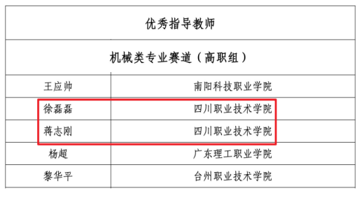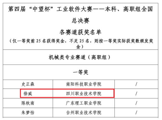 我校智能制造学院一直高度重视学科竞赛,积极组织老师对学生进行系统性、持续性培训,最终机械设计与制造专业徐威同学获得机械类专业赛道“一等奖”,徐磊磊、蒋志刚两位老师荣获“优秀指导教师”。