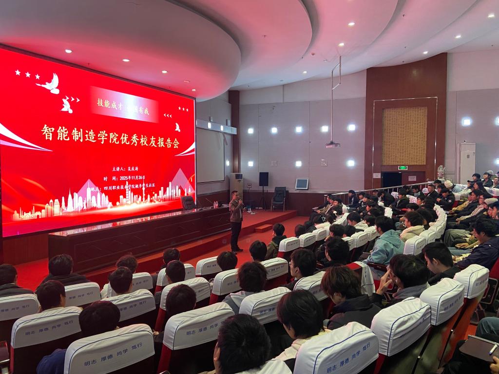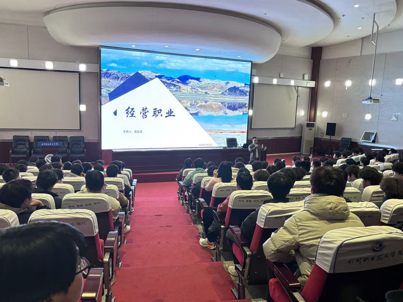 为发挥优秀校友榜样引领作用,助力学生明确职业方向、规划成长路径,11月26日,智能制造学院特邀 2019 届优秀校友、天齐锂业(射洪)有限公司特种设备副主管兼焙浸车间设备副主管吴庆涛返校,开展以“经营职业”为主题的专场报告会。学院师生代表200余人聆听报告。