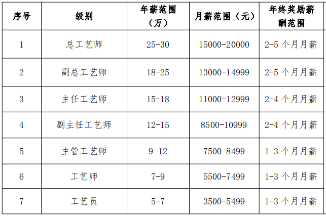 公司工艺技术人员实行工艺师职业路径管理,设置了从工艺员到总工程师八个等级的技术晋升通道,并设置了相应的8个等级、88个档位的带宽薪酬。薪酬根据技术人员个人能力确认等级、套档定薪。