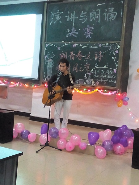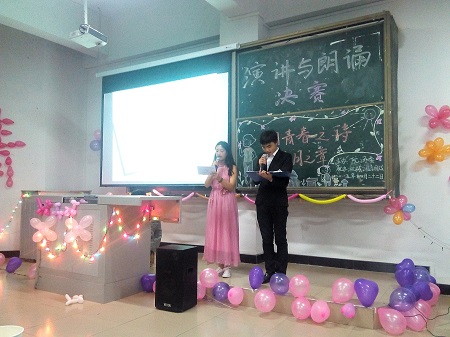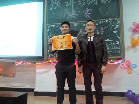 激烈的比赛在钱老师慷慨激昂的致辞中展开,青春承载着梦想翱翔。李飞飞同学铿锵有力的演讲着《读大学》,一字一句牵动着评审,赢得了澎湃的掌声和欢呼声;《再别康桥》的深情并茂,饱含深情的朗诵紧紧凝聚着观众的目光。比赛期间的脑筋急转弯和抢凳子游戏让青春躁动,欢呼声穿透每一面墙壁,争先恐后的向外炫耀。最后钱老师携同学们演唱《当》,熟悉的旋律,回忆青春追梦的同时主持人宣布数控4班李飞飞同学凭着他的演讲《读大学》夺冠。