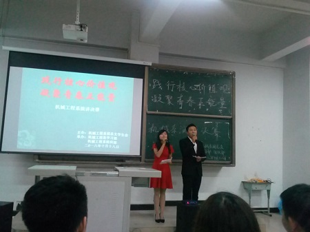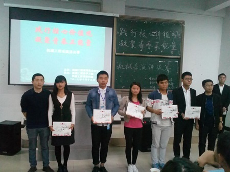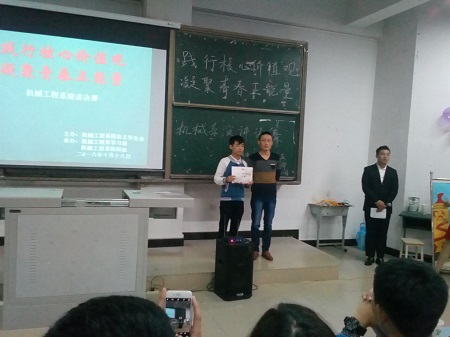 2016年10月18日晚,机械工程系团总支在5教311隆重的举行了以“践行核心价值观,凝聚青春正能量”为主题的演讲决赛。机械工程系团总支书记钱桂名老师、蔡春堂老师、姚大顺老师以及学生会主席团担任此次比赛的评委。