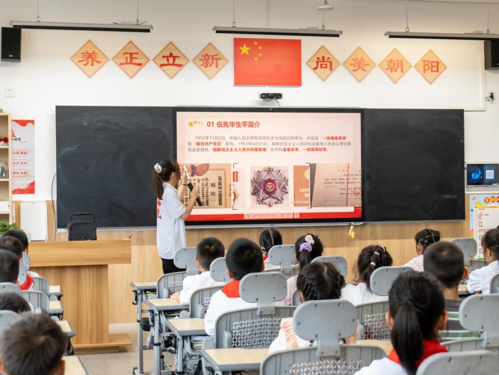 活动中,宣讲团成员胡泉为一年二班的同学们生动讲述了伍先华爆破敌堡的英勇事迹,真实庞大的作战减员、物资消耗数据深深地触动了同学们。随后,宣讲团成员马智、杨翔带领同学们来到操场组织团队游戏。活泼的音乐、融洽的氛围有效提升了班级同学的集体荣誉感,增强了同学之间的合作意识。