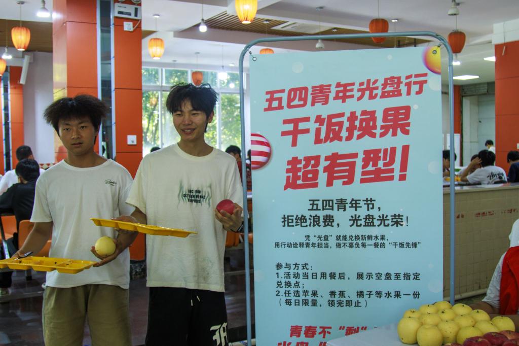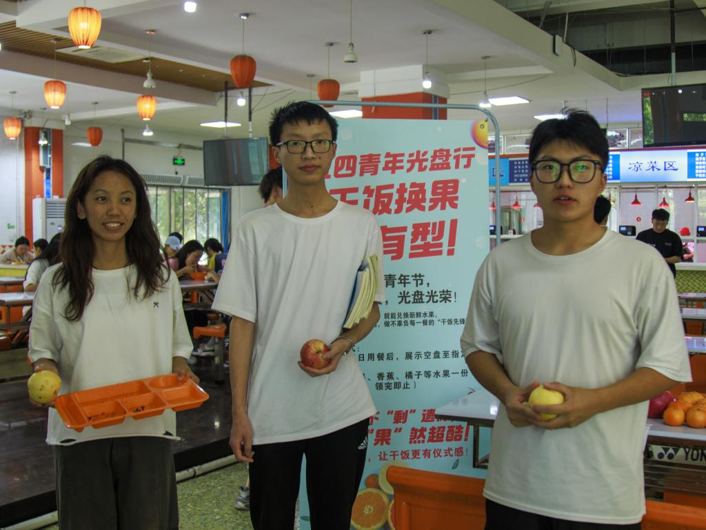 活动现场设置“光盘打卡区”与兑换区,学生用餐后到“光盘打卡区”拍照打卡后即可兑换苹果、香蕉等水果。为强化教育意义,志愿者团队同步开展粮食安全小知识分享,揭示全球粮食浪费现状,并分享勤俭节约的青年故事,引发广泛共鸣。活动兑换水果200余份,参与师生表示将长期践行“光盘”。