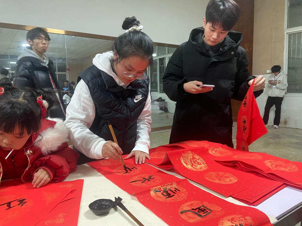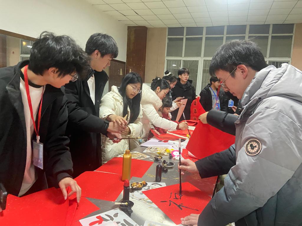晚会前的暖场互动区热闹非凡:书法台墨香四溢,师生挥毫写下春联福字,一笔一划晕染着中华文脉的温度;“时光信箱”前,信纸承载的期许里,藏着青年与文化根脉的联结;心愿墙上的彩色便签,把传统节日的仪式感揉进了青春的祝福里,提前拉满节日氛围。